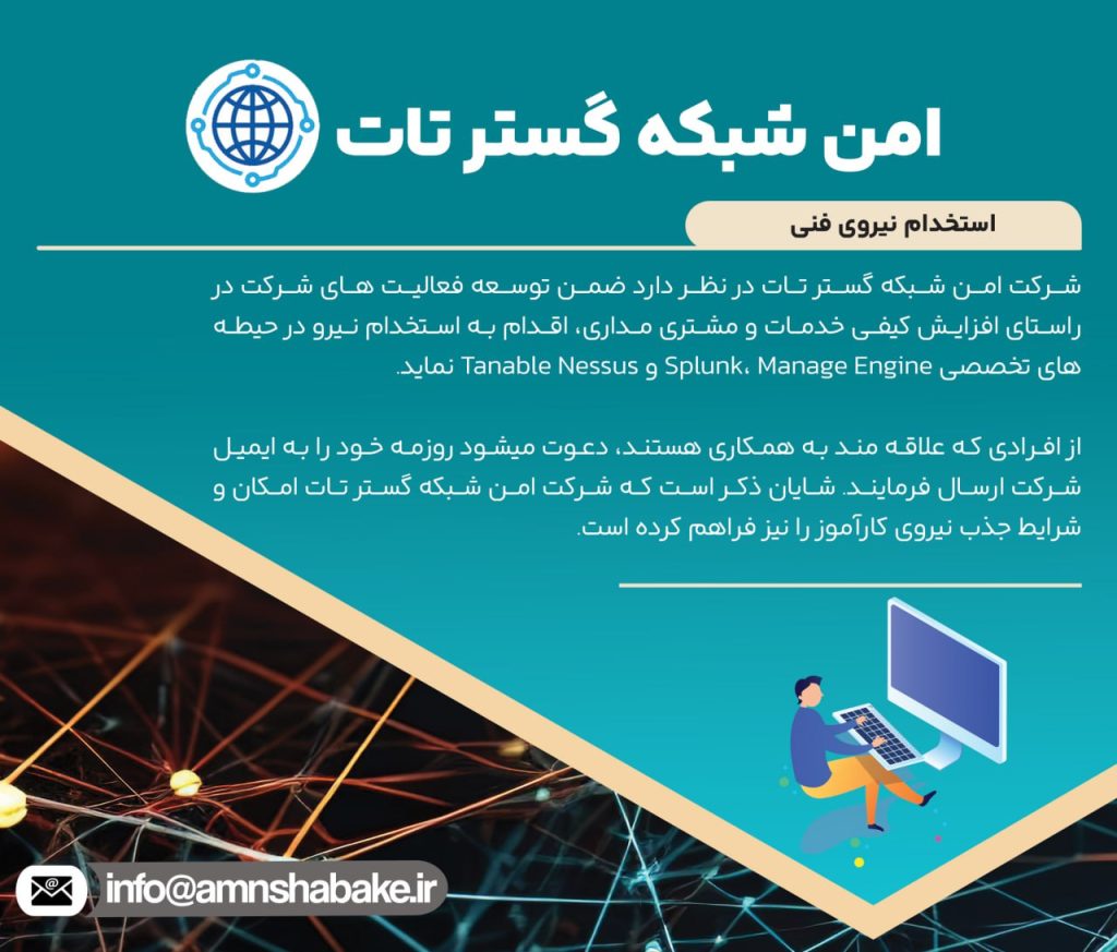 شرکت امن شبکه گستر تات در نظر دارد ضمن توسعه فعالیتهای شرکت در راستای افزایش کیفی خدمات و مشتریمداری اقدام به استخدام نیرو در حیطههای تخصصی Tanable Nessus و Splunk، Manage Engine نماید.